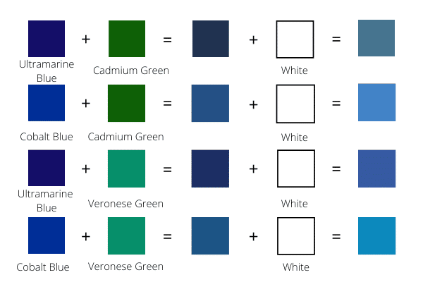 - Mix a tiny amount of green with a small touch of purple to get blue tones