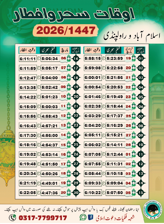 It is very important to know the exact timings of Sehr and Iftar for muslims around the world. In this article, we have given sehri and iftar timings for Islamabad.. Residents of Islamabad can easily check and download the calendar for Ramadan 2026 from here.