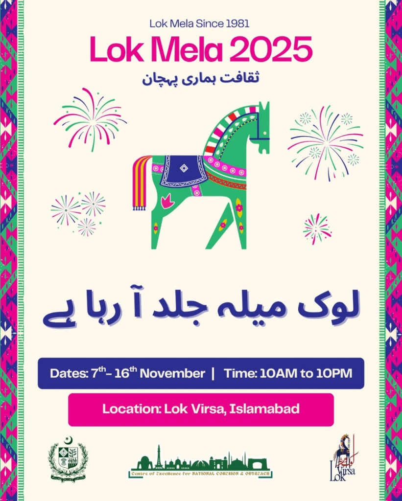 Lok Mela 2025 will make Islamabad colorful, musical and cultural once again. The ten day festival will be hosted in the Lok Virsa complex at Shakarparian and will be managed by National Institute of Folk and Traditional Heritage (Lok Virsa) and will be held between November 7 and 16.