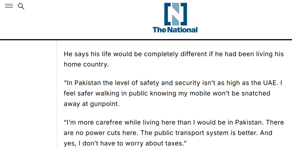 In a report by The National, expatriates, including Pakistanis, explain how day to day life in the UAE is safer and peaceful than in most of the countries they have resided in. One of the residents remarks on the freedom of movement in open spaces without fear of committing crimes or being harassed all the time.